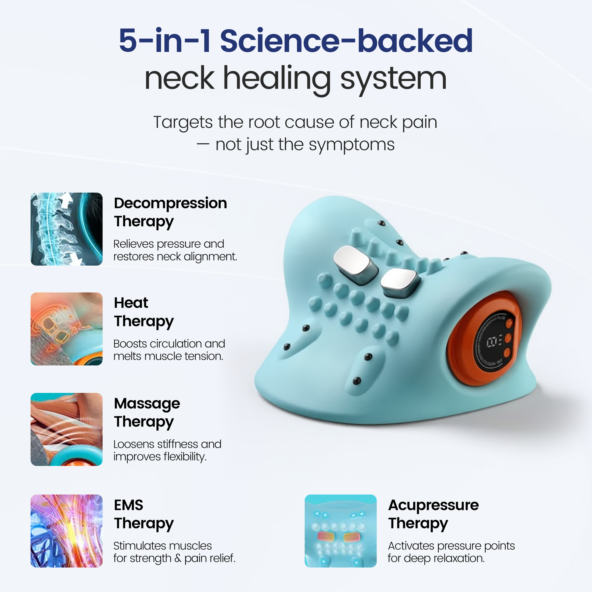 We packed the 5 most effective neck pain therapies into one easy-to-use device you can enjoy from the comfort of home: spinal decompression, EMS (electrical muscle stimulation), heat therapy, massage therapy, and acupressure.