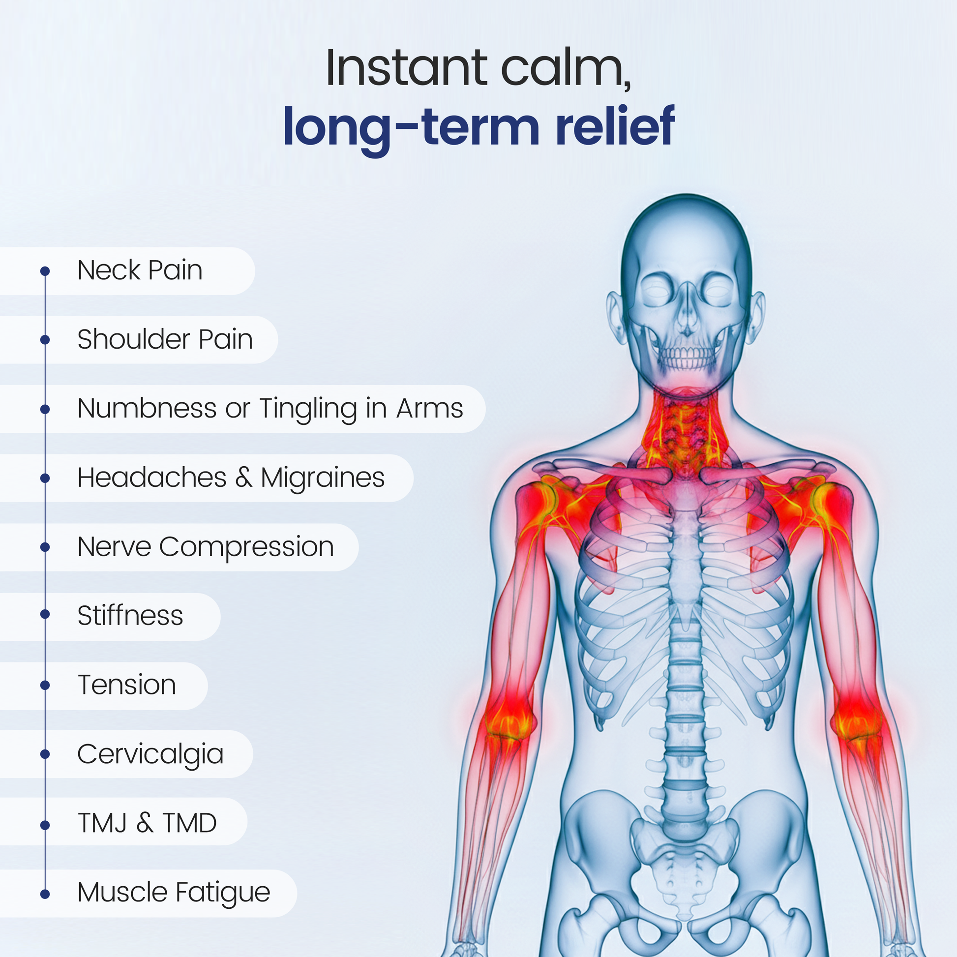 Through Soothe's relaxing heat, massage, & EMS therapy that comfortably stretch & loosen up tight muscles, and repair muscles tears & strains, it relieves tension, tightness, and corrects the posture. As a result, it naturally prevents future headaches & migraines.